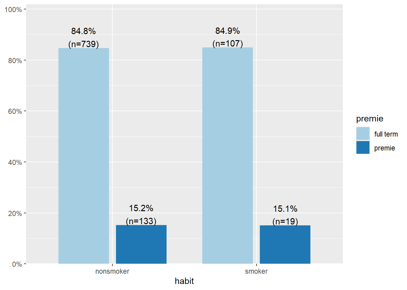 Contrary to what I was expecting, there is equal proportion of prematurely born babies to non-smokers (133/873, 15%) compared to babies born to smokers (19/126, 15%). There is no association between the smoking status of the mother and the likelihood of the baby being born prematurely.