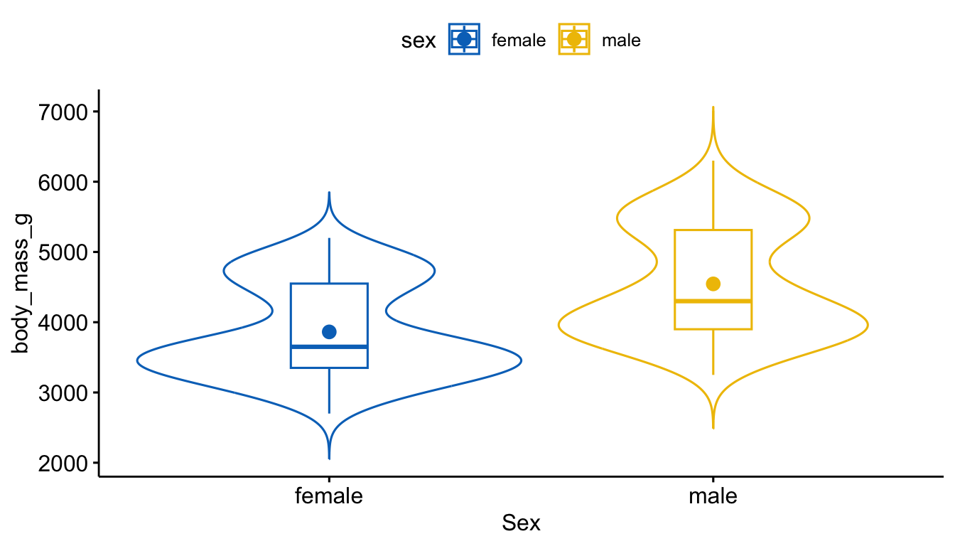 Let \(\mu_f\) be the average body mass for female penguins, and \(\mu_m\) be the average body mass for male penguins.